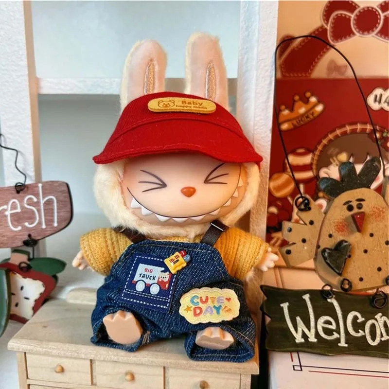 Labubu Clothes for Dolls Denim Overalls Set with Hat Labubu Outfit for 15-17cm Dolls Collector Labubu Doll Accessories Clothing